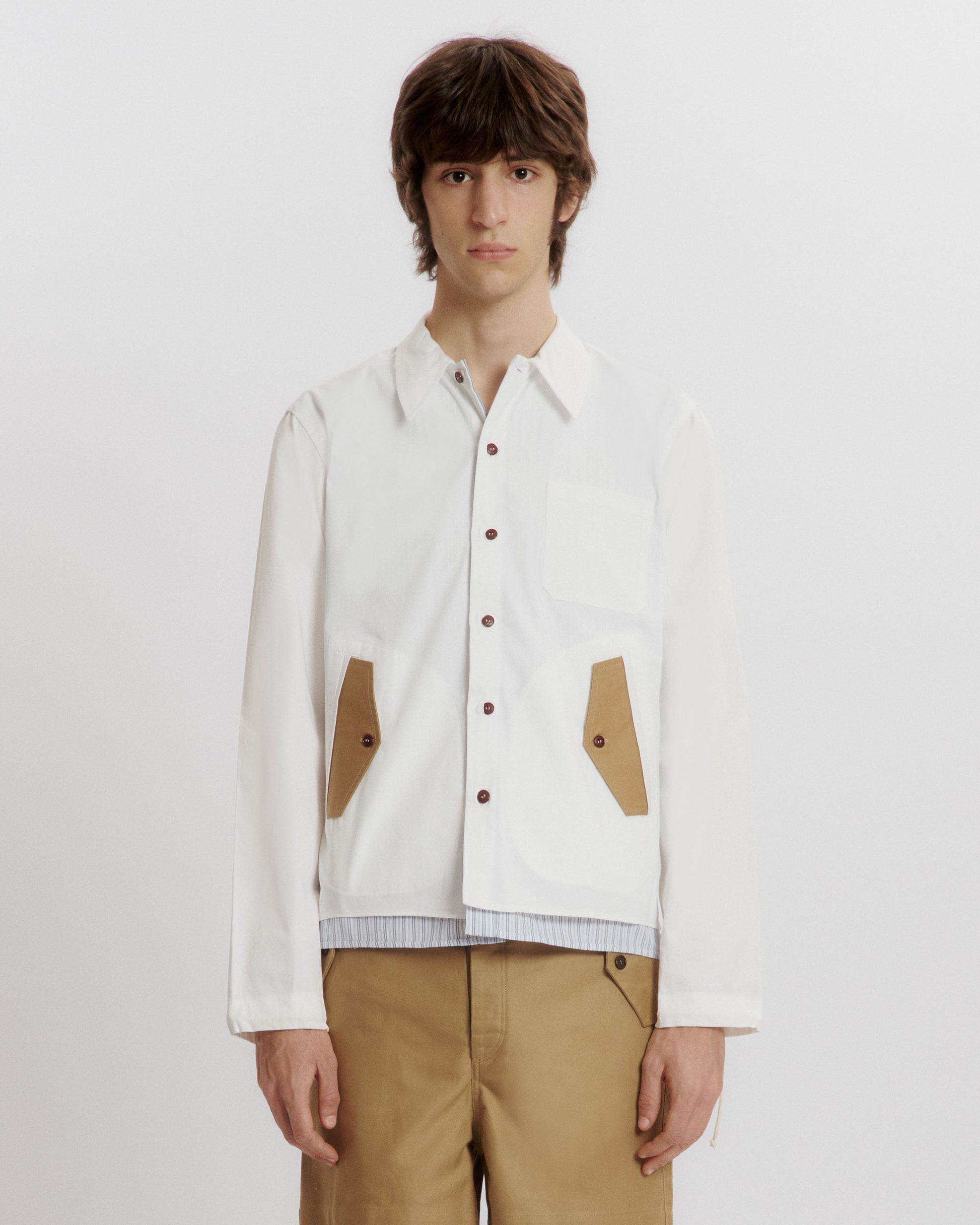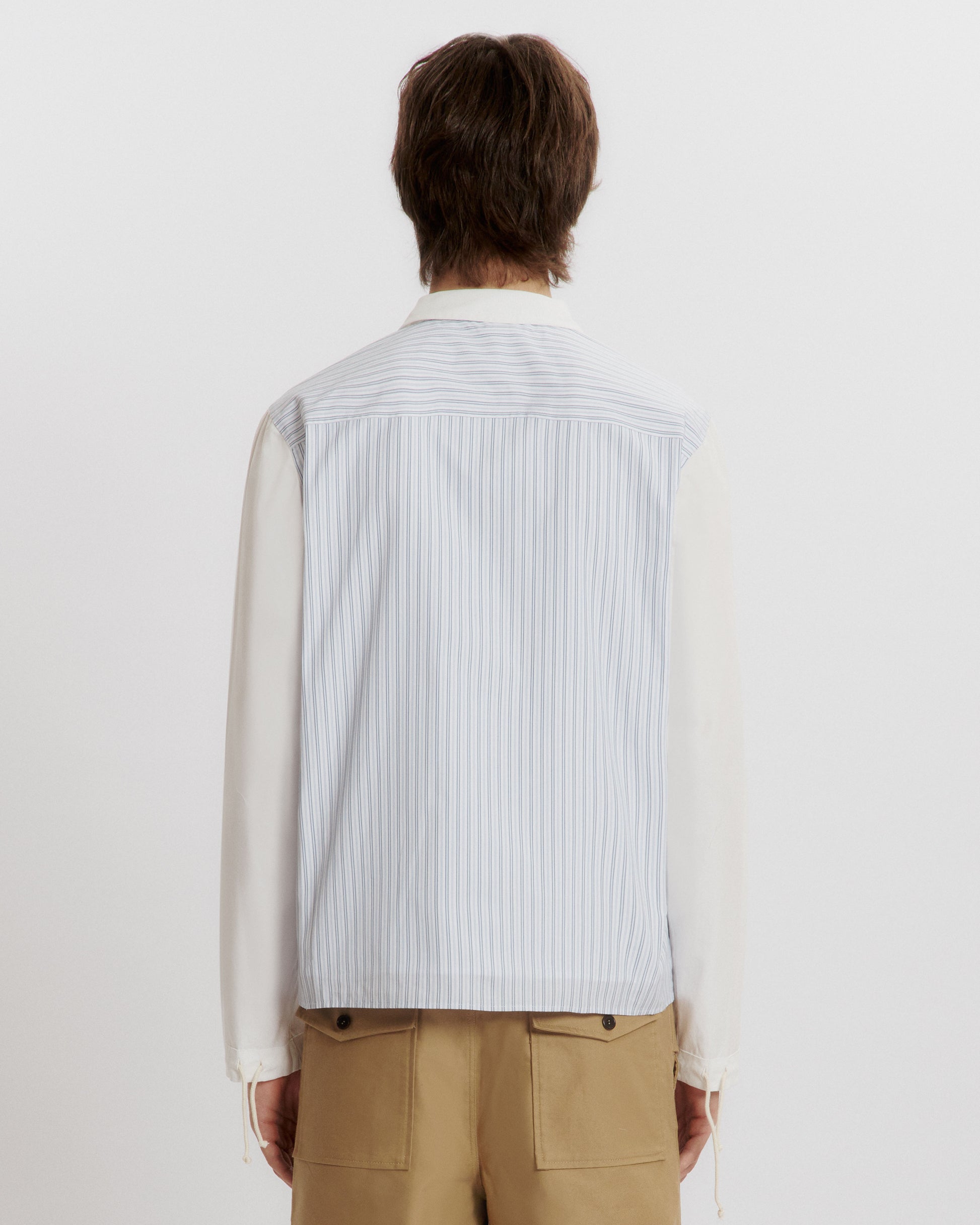Reversible jacket with contrasting brown pocket on the main side when reversed has a contrasting striped poplin lining.